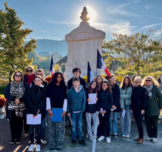 Ce lundi 11 novembre 2025, les élèves du Collège Le Revard ont pris part à la cérémonie commémorative organisée à Grésy sur Aix, aux côtés des élus, des représentants d’associations d’anciens combattants et de nombreux habitants.
